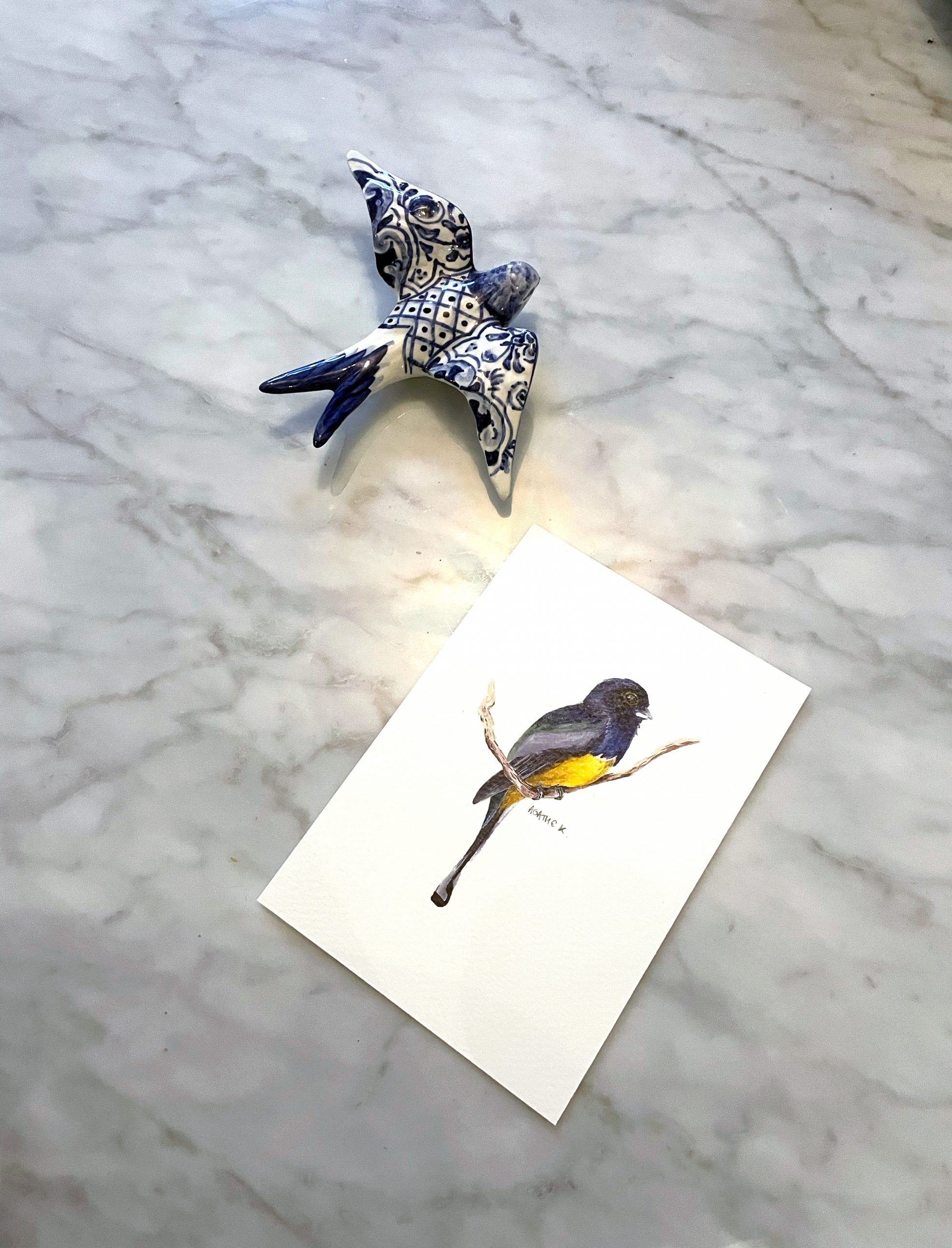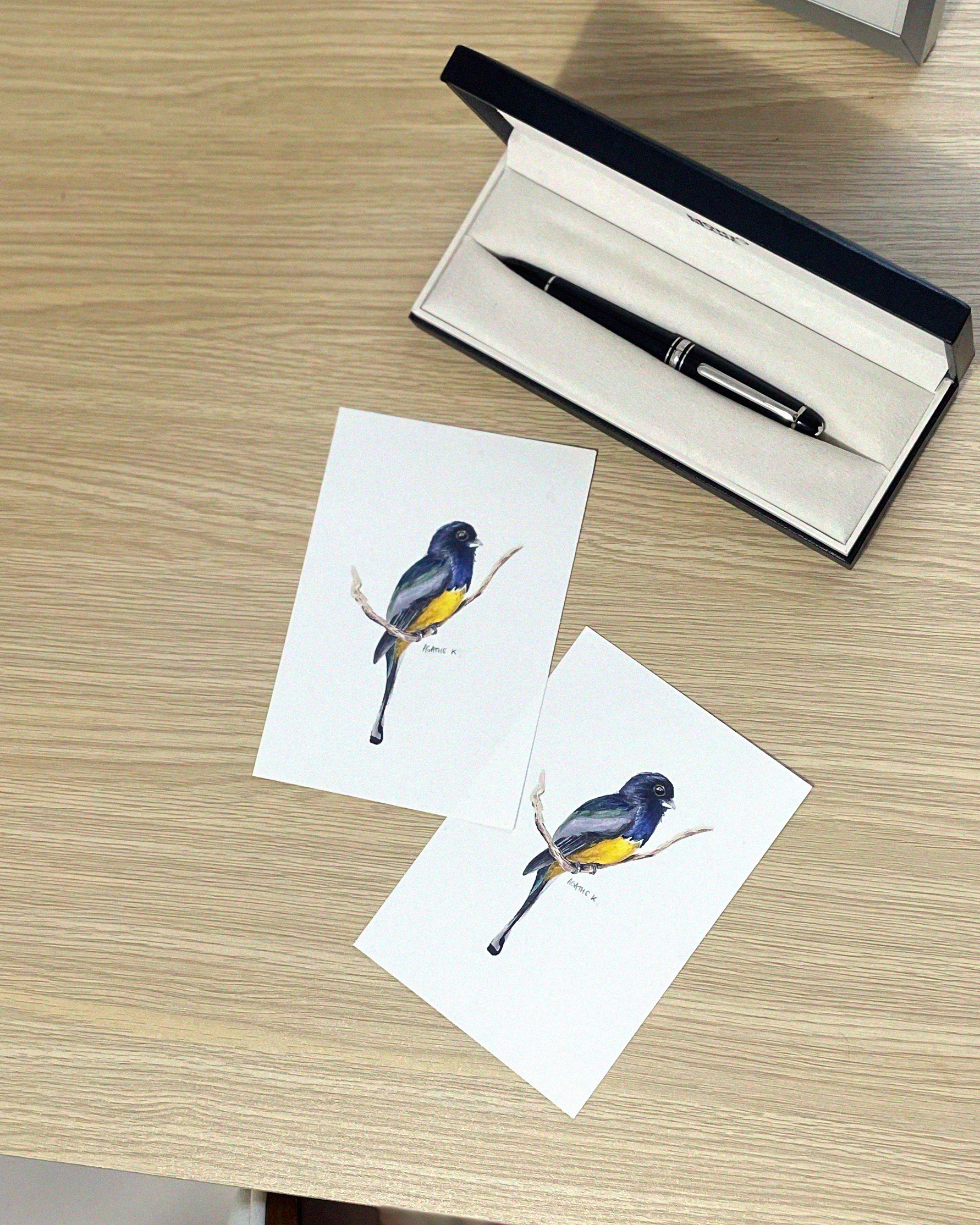 Trogon Surrucura, peinture à l’acrylique reproduite sur du papier exclusif texturé au format A5, signée à la main ou format carte postale.