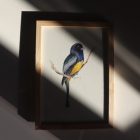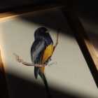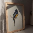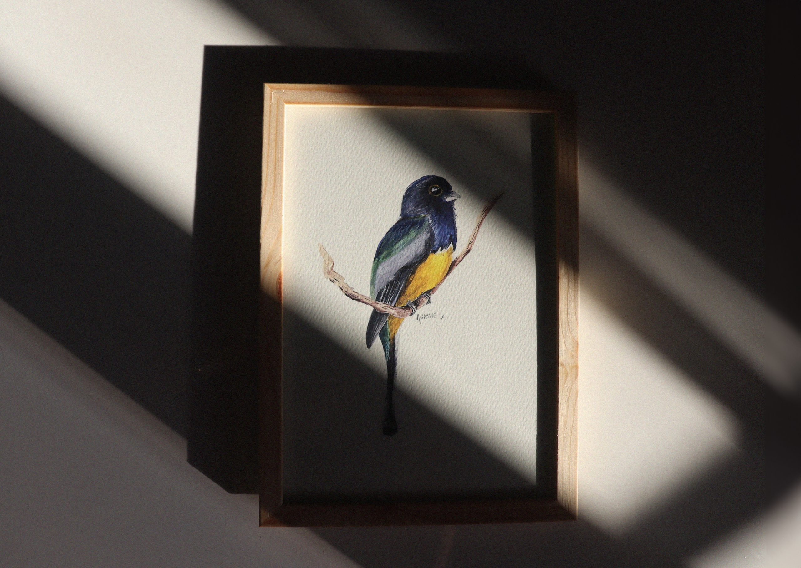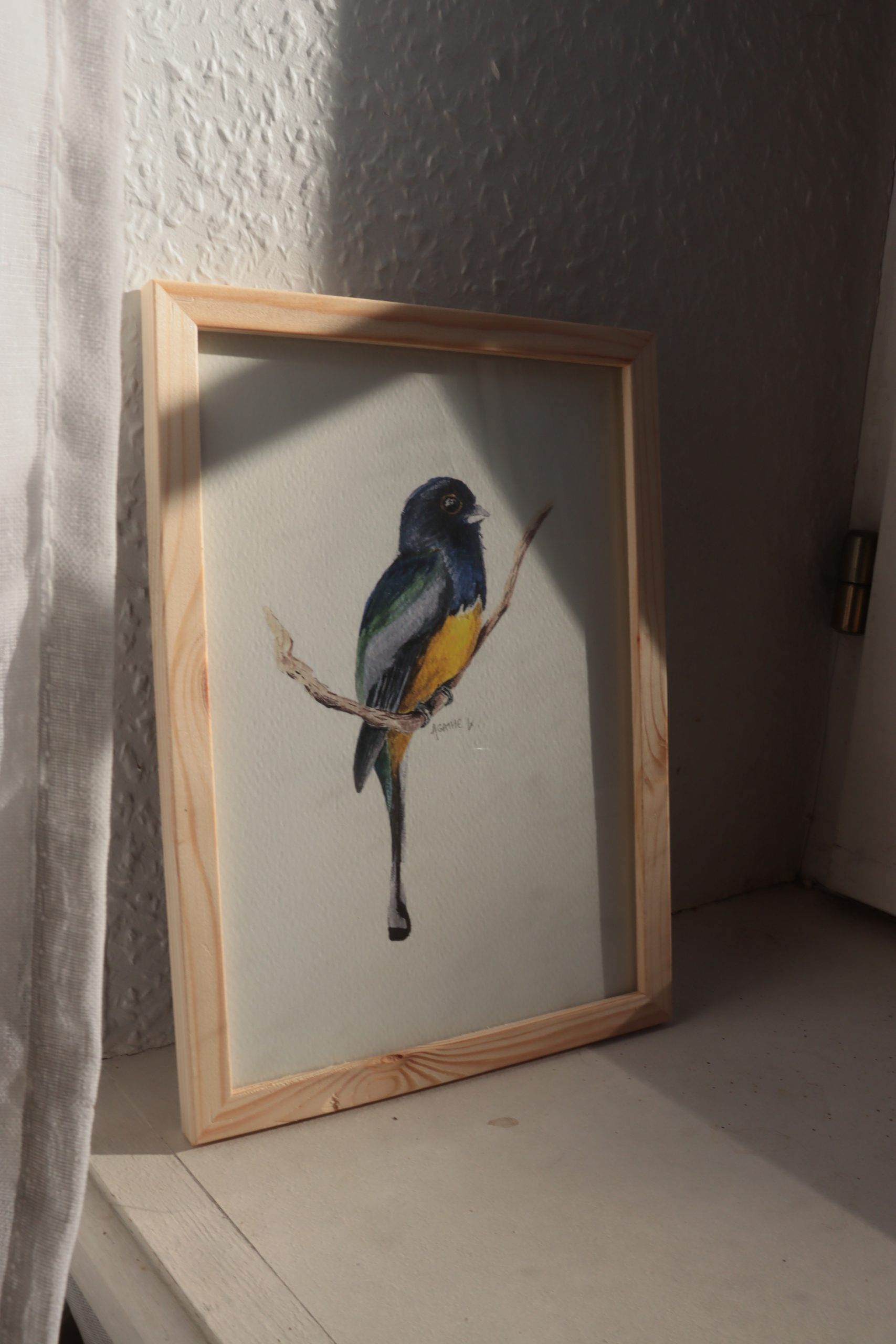 Reproduction d’une peinture à la main d’un Trogon Surucua, un oiseau au couleurs joyeuses.
